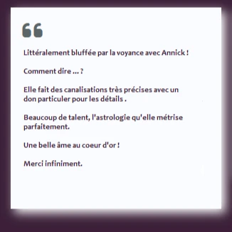 Dotée d’un don authentique et d’une sensibilité unique, Annick est reconnue pour la qualité de ses prédictions.